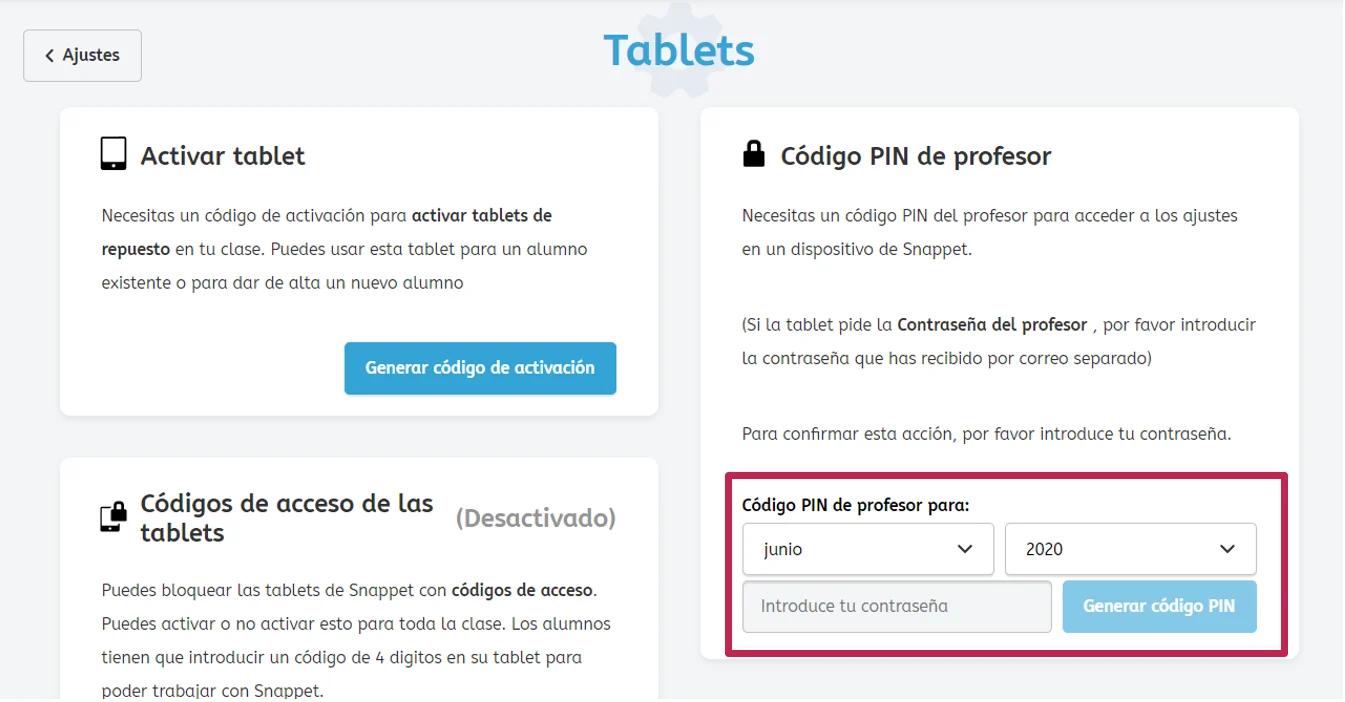 Por razones de seguridad, para acceder a los ajustes de la tablet es necesario introducir un código PIN que solo puede generar el profesor y que cambia todos los meses.